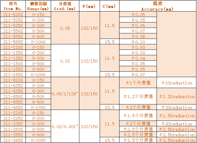 1.不銹鋼制造 Made of steainless steel. 2.尺身頭部帶限位釘,使用中主尺不會脫出 With limit screw to prevent the slider from pulling out.