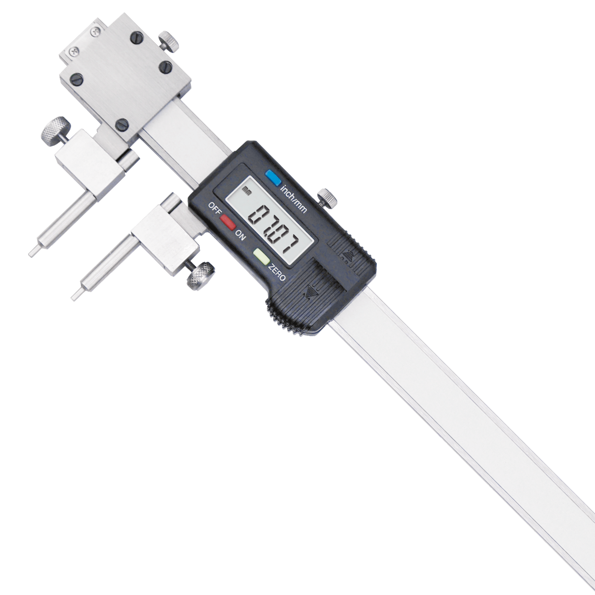 1.帶電源開關 Manual power on/off. 2.任意位置清零和公英制轉換 Zero setting and mm/inch conversion at any position. 3.帶數據輸出口 With data output interface. 4.可測量中心距大于5mm的兩孔中心距 To measure the distance between two holes whose center distance is above 5mm.
